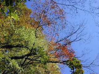|  見上げると、赤や黄色に染まった木々が青空に映えて見事です。 | |