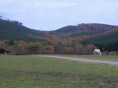 | 男池からまた車を走らせると、こんな牧場が出来ていました。 | 白や黒の馬がたくさん放牧されていて、喫茶店も出来ています。 |