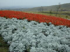 | 熊本県の「ヒゴタイ公園」です。もうシーズンオフになり、入園無料でした。ヒゴタイの花は枯れてしまって真っ赤なサルビアと白妙菊が最後の美しさを放っていました。 |  |