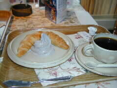 | ここの名物メニューは黒ゴマのソフトクリームです。私はマロンケーキとコーヒーのセット。 | 夫はクロワッサンのセット。勿論どちらにも黒ゴマのソフトクリームがついてました。 |