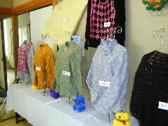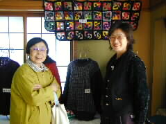 | 俳句の友達と一緒に見て廻りました。 編物の大好きな永岡さんと婦人学級の編物の先生の稲生豊子さん(右)の話が弾みます。 | 色違いの同じデザインのセーターですが、こんなに雰囲気が違って見えます。私も編物は大好きでよく編んでましたが、また編みたくなりました。 |