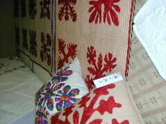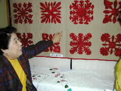 | パッチワークの朽網真由美先生が、見事な展示作品の説明を詳しくして下さいました。 | これはハワイアンキルトといって、まわりのキルトは海の波を表しているんだそうです。 |