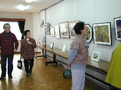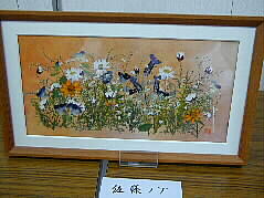| 会場には散歩を兼ねて見学の方が次々と訪れています。皆さん熱心に作品を見ています。 | 押し花です。本物の花を押し花にして絵を描くように置いてあります。佐藤ノブさん作 |