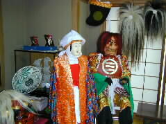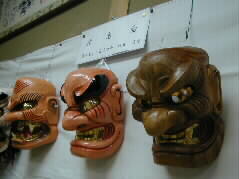| 富士見が丘自治会長の佐藤延登さんの作品の神楽面。古くから伝わるお神楽を守りたいと足りない神楽面を自分で作り出されたことがきっかけとか。 | 恐ろしい鬼の面から女人の面、ひょっとこ面まで様々なお面が展示してありました。 こうして文化が継承されていくのだと感銘を受けました。 |
