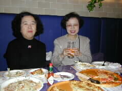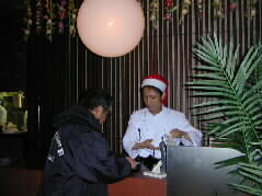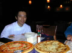 | ウエイターさんもサンタの帽子を被って楽しそう。とてもおいしいピザでした。ごちそうさま。 |  |