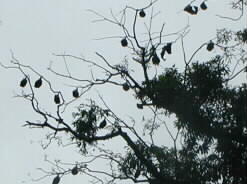 | Many bags are hanging down from the tree: yes, they are bats called "Gray headed bat" making high-pitched chirping on the tree or in the air. I was very surprised to see them. | ![]() |