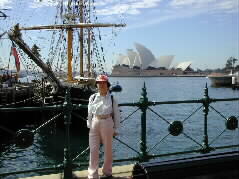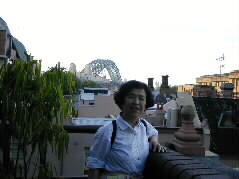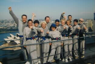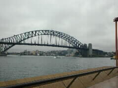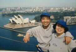 | High above the blue sea and white Opera House, I was satisfied with a little fear and a hard walk up to the top. The cap, handkerchief, and glass are all tied to the safety strings so as not be blown away by the strong wind and fall on the bridge or onto the sea crowded with heavy traffics of cars, trains, and ferry boats. | ![]() |