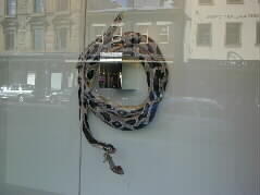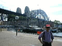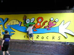 Just a couple of minutes from the hotel take me to Circular Quay, the terminal of the ferryboats. Not only the tourists but also commuters or students make use of the ferryboats. Above the Quay is an elevated railroad station. Under a railroad bridge, a painter was making a funny sign like this, showing the Rocks district. |