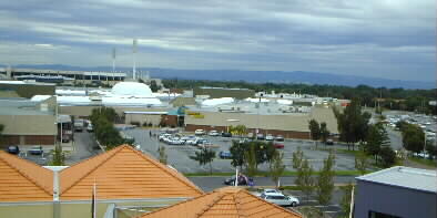A view from the hotel window: red roofs of the entrance hall of the hotel, West Lakes Mall building complex beyond the street, and a football stadium with tall illumination towers behind the Mall. Car parking lot is still near empty early in the morning.