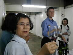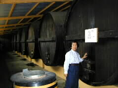 大きな大きな樽の側を通り、半地下のようなワイン倉に案内をされました。見上げると上にもたくさんの樽が並んでいます。今から試飲が始まります。 |