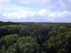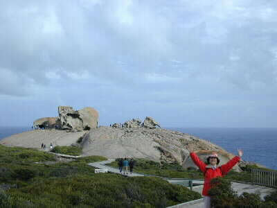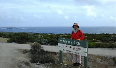 In the west end of the Island is Admiral Arch. The color of the sea is really beautiful. Behind me in the bush is a walkway down to the shore. The plant doesn7t grow high because of strong wind, they say.