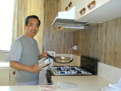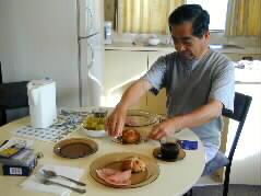 I got up early in the morning and my husband helped me in preparing breakfast. He fried ham using a frying pan kept in the room, prepared coffee, warmed bread with a microwave, and wash a bunch of grape. It was simple, but tasty for me.