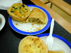 Today's lunch is Aussie pie at a cafeteria in the center. As there are so many kinds of tasty-looking pies in the case, we took four kinds of pie. A cute salesgirl was amazed if we could actually digest all of them. A round vegetable pie (right) was nice as well.