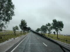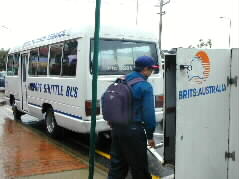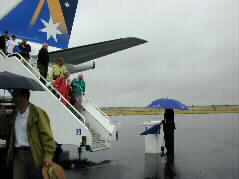 | "Dry, sun-baked red land" had been our first image of the area. What was surprised, it rained! Passengers needed umbrellas to walk to the terminal building. | ![]() |