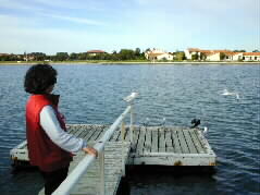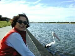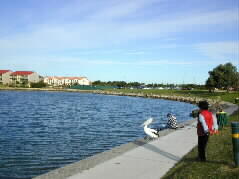 ![]() レイクに水鳥がいっぱいいますが、特に珍しいのがペリカンです。朝や夕方にはつがいで悠々と飛んでいるのできっとこのレイクの主なんでしょう。実際に自然のペリカンを見るのは始めてです。側へ寄っても逃げません。思った以上に大きいです。そして長い大きなくちばしと目がぬいぐるみのようです。釣った魚をもらうからでしょう、釣り人のそばから離れません。 |
