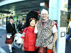 ![]() 市内各所に団体の集合場所が決めてあって、各団体が準備をしています。私たちにはバグパイプの演奏がとても珍しかったので写真を撮っていたら、大きなだちょうの毛の帽子を被せてくれました。大きくて重くて私は手で支えています。大太鼓担当の方で、身には毛皮をまとっています。背中には頭もついている毛皮です。 |