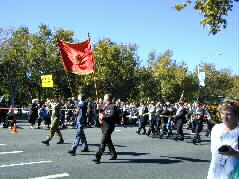 ![]() | それぞれ当時の隊別にプラカードや旗を先頭に行進が始まります。当時の軍服の人や、背広に勲章をたくさんつけた人、腰の曲がった人など様々です。 |