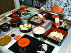 The special breakfast to celebrate the New Year. On the table are beautiful dishes we prepared until yesterday. We sat on the table in kimonos. |