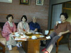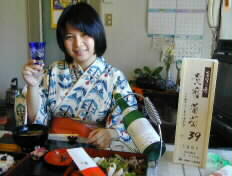 | Lillian wears my kimono I wore in my young days; it fits her very well. We tasted a bottle of special wine instead of Otoso - a traditional special sake drink. We wish we would have sound days this year. |