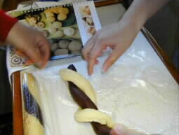 We prepare two kinds of dough, one is white, the other is brown including cocoa powder. The two doughs are crossed each other to make marblr dough bars. The bars are wrapped and matured in the refregerator.