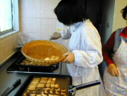 The dough bars become hard after a while. They are thinly sliced in various shape and put side by side on a pan. After baking in the oven of 170 C for 15 minutes, the cookies are well browned and taken out of the oven.