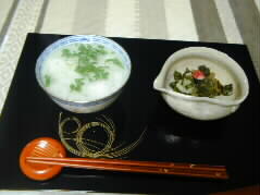 今日は七草の日です。お正月のご馳走に疲れた胃にやさしいお粥、昔の人は本当に合理的な考え方をしていたと感心をさせられる日本の風習です。 「七草なずな、唐土の鳥が、渡らぬ先に、、」昔から七草を刻む時に母が歌っていた歌です。どういう意味か、よくわからないけれど、やはり私も歌いながら刻んでいます。なかなか七草は揃わなくて、大抵2-3種のお野菜なんですが。 |