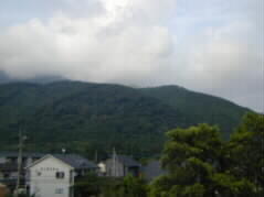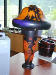 | 2階の「めいぶん」にやってきました。ここはいつもは、おいしいお酒を飲む大人のバーだそうですが、素適なコンサートホールにもなるお部屋です。素適なガラスのスタンドがありました。また、大きなガラス窓からは、、あれれ?今日は由布岳は雲の中ですね。 | |