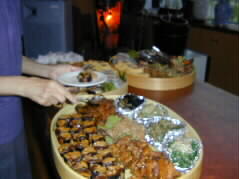 | さあ、乾杯のあとは、おいしいお料理を頂きます。本当にいろいろな湯布院のおいしい食べ物が並んでいます。手前の丸いのは、ナスの田楽、お味噌がとっても良いお味でした。その向こうには豊後牛の串焼き、とても柔らかくておいしかったです。 |  |