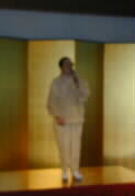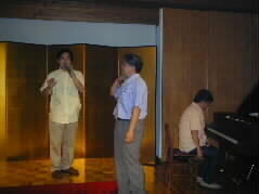 | なにやらごそごそと相談中だと思ったら、なんと、菊池さんのピアノで山口さんが歌ってくれるそうです。本日の司会進行をしてくださった、観光協会の事務局長の米田さんが、ニコニコと紹介をして下さっています。 |  |
