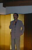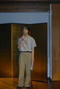 | 今日は、音楽祭、映画祭、双方のスタッフ、そして役場関係の方、観光旅館組合の皆さん、とたくさんの方が集まっておられます。まずは主催者の代表、 催事専門部会の夢想園の志手さんの開会の挨拶です。続いて溝口薫平氏による、乾杯の音頭、また音楽祭の加藤昌邦さん、映画祭の伊藤雄氏の挨拶もありました。(写真左から) | |