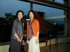 | チェンバロの演奏会の開かれる東急ゴルフクラブで演奏会前の貴重な時間にカメラに収まって下さいました。    左は小林道夫さん父娘です。右はバイオリンの川田知子さんとメゾソプラノの野々下由香里さん。 | |