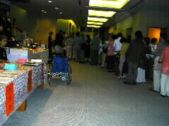 | 夜の7時半の開場を待つ人の長い行列が出来ている東急ゴルフクラブのロビーです。 |  |
