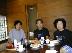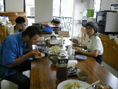 | 今年も私達は、音楽祭期間中は「かなかな亭」で福岡からのボランテイアスタッフの山口君と音楽祭家族で暮しています。朝食はパンにサラダ、そしてコーヒーでおいしく食べています。 |  |