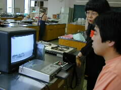 | デジタルカメラ写真班の山口さんが、演奏家に渡すためにビデオプリンターを使ってその場で写真として打ち出しています。これは大層喜ばれました。 |  |