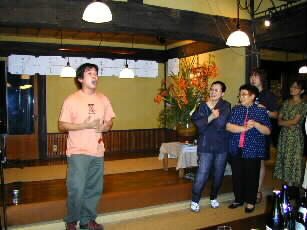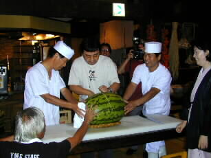 | 夜の7時からは湯の岳庵でフェアウェルパーティーが盛大に行われました。       左は富山から届いた大きなスイカのカットをする音楽監督の河野さん、右は実行委員の山口さんが皆に請われて歌っています。 | |
