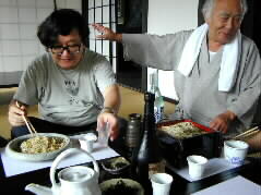 | 泉そばのご主人はおいしいお蕎麦の話をたくさんして下さいました。ご主人の前にあるのは「せいろ蕎麦」渡部和さんの食べているのは「おろし蕎麦」です。 その後、演奏家の大森さん、市坪さん、渡辺さんは、車で大分空港へ向かわれました。また、湯布院で演奏をして下さいね、と別れました。 来年、27回目のゆふいん音楽祭はどんな演奏会になるでしょうか。今からもう楽しみです。(終わり) |  |