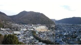 | 朝、赤とんぼ荘の7階の部屋からの景色です。正面に鶏籠山がそびえ、揖保川が流れ、小京都と呼ばれる瓦屋根の美しい龍野です。左の緑の横に実家が少し見えています。 | |