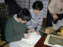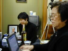 | 部屋に引き上げてきてからも二次会が賑やかです。岳人が、祖父母のルーツをいろいろと聞くので母が江戸時代の昔からの話をしてくれました。これは記録しておきたい話だと思って私は一生懸命聞き書きをしました。恭代さんの後ろには父の写真が置かれています。 | |