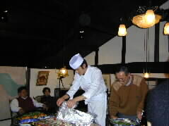 | 会場の湯布院花の木通りの「北山」に着きました。二階のギャラリーでは、北山のご主人とコックさんがお料理の準備に余念がありません。 |  |