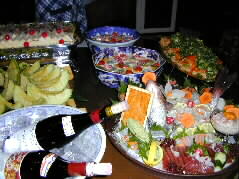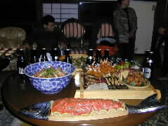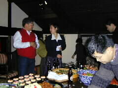 | あちこちで楽しい話の輪が出来ています。そしてお料理や飲み物も次々と皆さんのお腹に入ってます。 | |