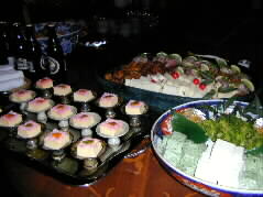 | お料理もさることながら、器も見事で見とれてしまいました。手前はサーモンがサーモンの形の器に盛られています。 |  |
