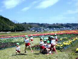 | 良いお天気とチューリップに誘われて近くの幼稚園から遠足に来ていました。かわいい元気な子どもたちです。 |  |