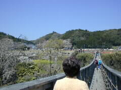 |  | 滝が良く見える吊り橋「滝見橋」がかかっています。しかし、ユラユラ揺れてちょっと恐い、スリル満点です。 吊り橋の右が滝、そして向こうはサクラが咲き、茶畑が広がる緒方平野です。 |