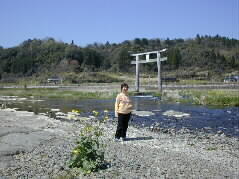 | ようやく吊り橋を渡りました。そして滝の上にきました。川の中に大きな石の鳥居、八幡宮の鳥居です。 この穏やかな流れが、、、、 |  |