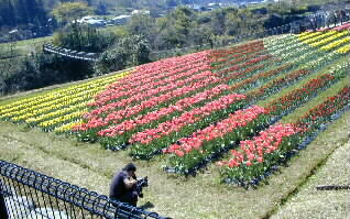 | 私達はテイクアウトでチューリップを見ながら食べました。目の下のチューリップをテレビ局のカメラマンの方が撮影をしています。色分けがとてもきれいまさしく今年のテーマ「華の波」です。 |  |