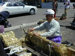 | こちらは緒方町のボランィアの方が、昔懐かしいムシロ編みの実演を見せています。お米が俵に入れられていた頃には農家の大事な仕事でしたが、今はとんと見る機会がありませんね。 |  |