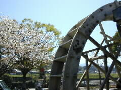 | 滝のすぐ側の藁屋根の茶屋の前には大きな水車が置かれています。 |  |