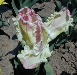 |  珍しいチューリップがいろいろありました。 赤や黄色の八重咲きの花は、チューリップと言われなければ、ちょっとわかりませんね。 ここには30万球、90種類のチューリップが植えられているそうです。 | |