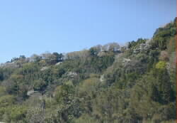 |  | さあ、もっともっと見ていたいチューリップですが、日差しがきつくて顔が真っ赤になりそう。 チューリップとお別れをするとすぐ竹田の町、岡城の石垣とサクラが見えます。 |