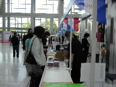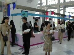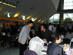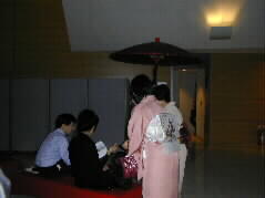 | 広いロビーは、テーブルがたくさん準備され、好きな所で食事をします。お茶席もありあちこちで華やかな人の交歓が繰り広げられています。 | |